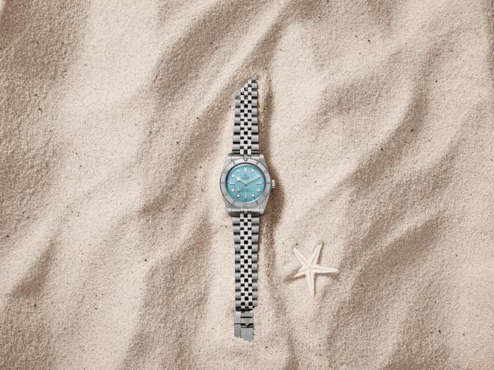 Tudor帝舵表推出全新碧湾54型“极境蓝”款腕表(BlackBay54“LagoonBlue”)。这枚腕表表盘尺寸为37毫米,搭载了磨砂质感的“极境蓝”表盘,配备镜面磨光外圈,呼应了阳光明媚时蔚蓝海浪拍打着沙滩的意境。