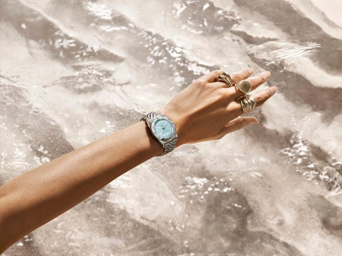 欧米茄(OMEGA)同样也在海洋主题腕表上有了更新。界面新闻注意到,欧米茄近期推出了38毫米和41毫米的绿松石色海马系列AquaTerra腕表,搭配陶瓷表圈和一体式橡胶表带。