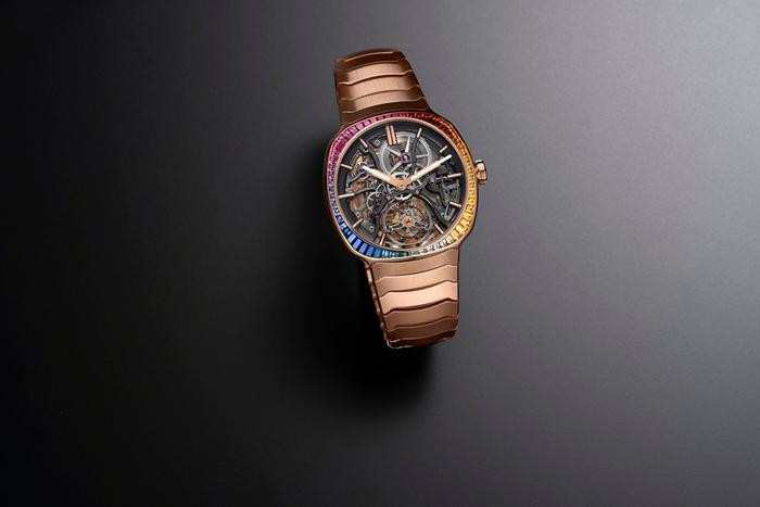 亨利慕时疾速者系列近期推出了两款全新陀飞轮镂空彩虹腕表,分别采用5N红金和精钢两种材质打造。这是亨利慕时疾速者系列较少有的镶嵌了珍稀宝石的设计:这款标志性表款的外圈用60颗色彩渐变的蓝宝石勾勒出彩虹色调,凸显了这一表款的枕形轮廓。