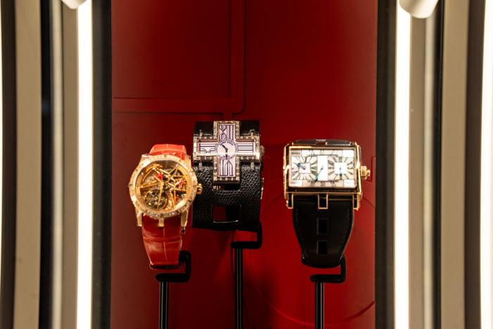 该罗杰杜彼展览工作人员在现场告诉界面新闻,其中一些早期表款为客人私人定制,其中一些更是首次亮相中国市场。罗杰杜彼在展览上也介绍了个性化定制服务,包括特殊功能组合、表盘装饰工艺、机芯构造的定制化路径等等。